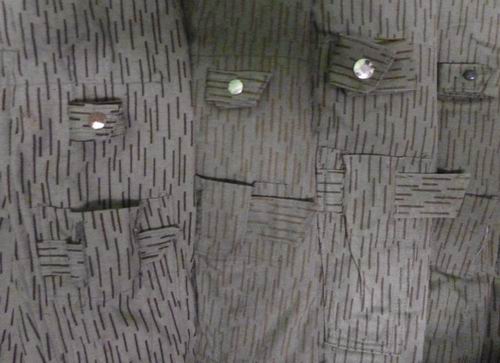 Auf dem unteren Foto nun ein weiteres Detail dieser Anzüge, welches von den normalen FJ Anzügen deutlich abweicht. Im Rückenbereich der Jacke, in Höhe der Nieren , gibt es zwei Fächer, die von innen mit einem Knopf verschlossen werden. Das obere Fach ist ca. 30-35cm lang und das Untere ca. 15cm. Über die Verwendung können wir nur im Moment nur spekulieren, denn unsere "Quellen" haben dieses Detail nicht mehr in Erinnerung. Passen würde der Einschub von dünnen Metallplatten, um einen überraschenden tödlichen Nierenstich von hinten abzuwehren. Auch der Einsatz von Wärmeelementen (m. Batterien?) zum Schutz vor Unterkühlung des Nierenbereiches für einen Scharfschützen/Beobachters kämen in Betracht! Vielleicht können uns dazu Besucher unserer Webseite weiterhelfen!