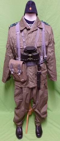 Fähnrich als Grenzaufklärer Sie waren wohl die Elite der Grenztruppen der DDR.Handverlesen durch das MfS und geprüft durch die Verwaltung 2000. Die Grenzaufklärer operierten im vorgelagerten Grenzbereich meistens allein und verdeckt. Die einfachen Grenzsoldaten mochten sie nicht,da sie auch die eigenen Kräfte beobachteten und Wachvergehen gleich mit schönen Fotos meldeten. Schon ein freundliches Winken in Richtung BRD wurde als "Kontaktaufnahme mit dem Feind" ausgelegt und oft unverhältnismäßig bestraft. ca. Anfang 1979 FDU-Sommer m52 m. HT-ES, Hemd m.Binder Gr.40N, Offz.Käppi Gr.58, Stiefel chrom Gr.29, Koppel 120cm m. Tasche, Kamera Practica MTL3, UKW Funkgerät UFT771, Grenzfunk PSE-FMN, Regenmantel, Feldflasche Verkauft in Reichsmuseum Kopenhagen/ Dänemark. Exponat in einer Ausstellung zum Kalten Krieg im Ostseeraum.