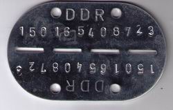 Auch in der DDR hielt man bis zum Ende der NVA/Grenztruppen an der sogenannten Erkennungsmarke ("Hundemarke") in guter deutscher Tradition fest. Das Teil war aber ein Relikt einer überholten Kriegsführung. Jeder militärische Konflikt an der Staatsgrenze zur BRD (Nato) wäre binnen 24 Stunden in einen atomaren Krieg eskaliert. Durch "Planspiele" wusste man auch bei der NVA , dass nach 48 Stunden 90% der Soldaten Tod bzw. Kampfunfähig gewesen wären. Wer hätte von diesen Millionen Toten die Marken einsammeln sollen, auswerten und wen wollten sie noch benachrichtigen?